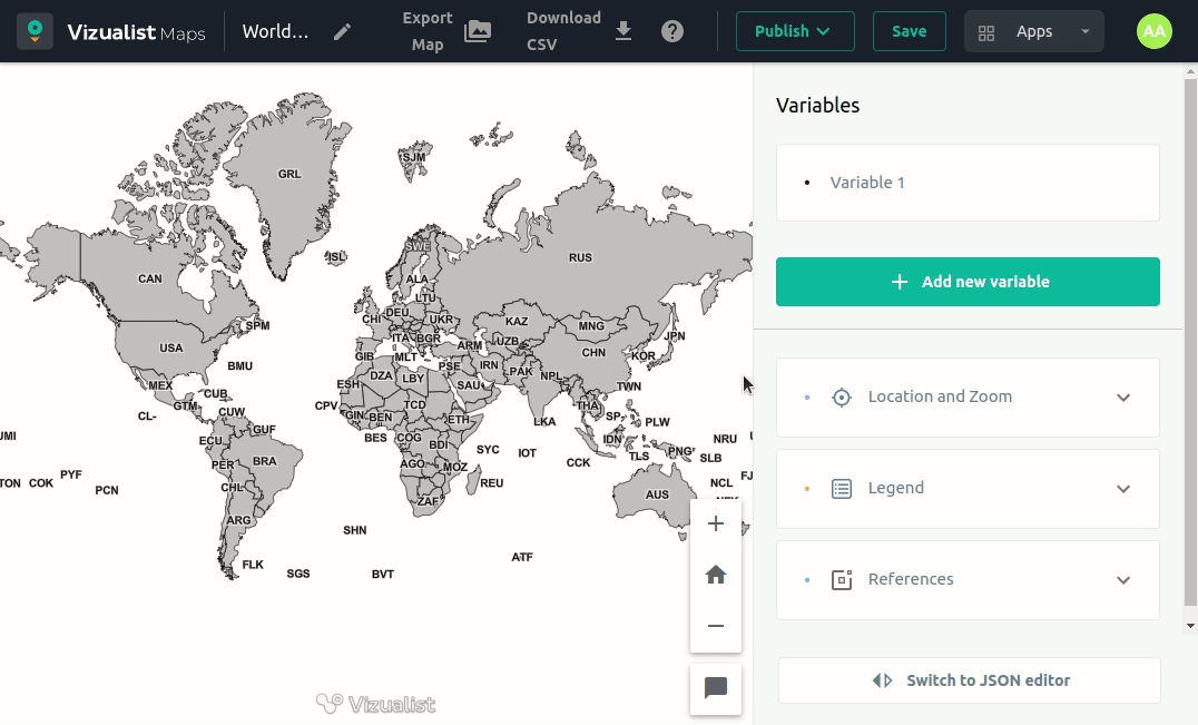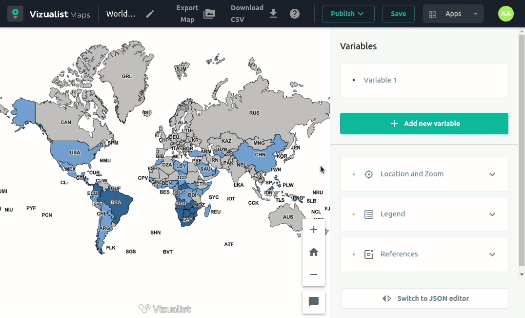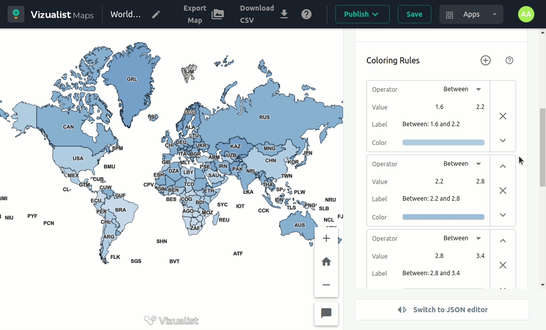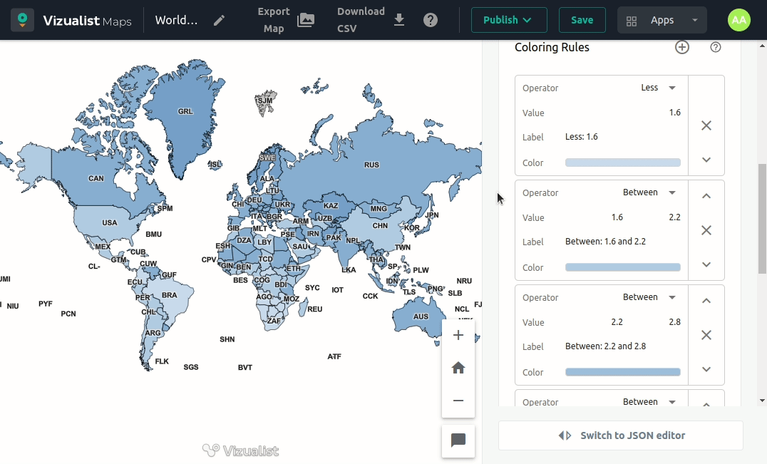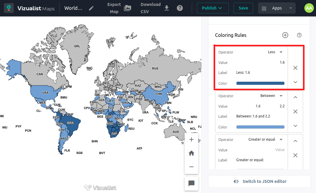 Coloring rules are prepared by default, but you can edit them and show values within a specified range with the same color. Use different operators, set preferred values, labels, and colors, and move them up and down until you are happy with your map visualization.