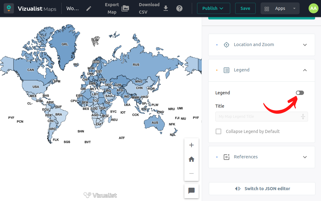 In the right-hand sidebar click on the Legend dropdown menu and by clicking on the button you can enable or disable Legend.