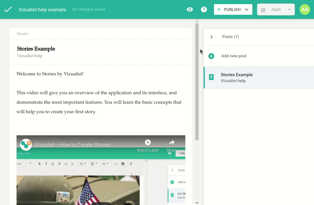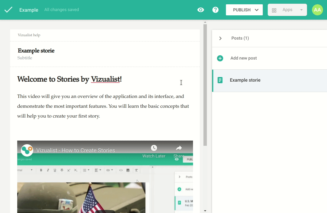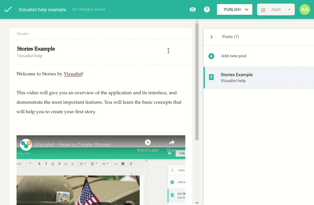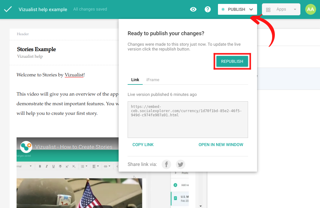 Stories allow you to revisit every story you've created, even the ones you already published and embedded, and update them. You can update the content of your story, without affecting the embedded version of your story. All the changes will be visible only to you, and when you decide to allow your audiences to view the latest version of the story, you'll need to republish it.