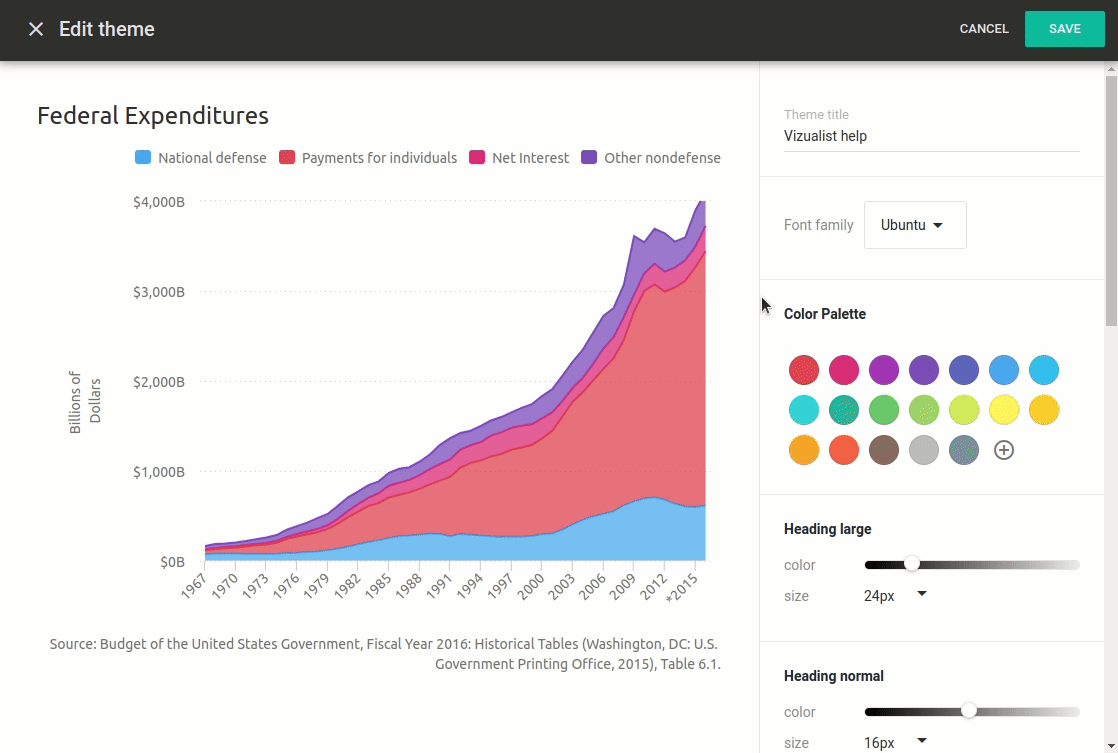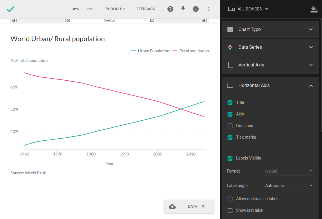 While removing unnecessary design elements is crucial to declutter your chart, it’s just the first step. Remember, the focal point of every chart is the data, so make sure the remaining design elements don’t overshadow the data itself. To customize these elements, we’ll need to go into the theme editor.