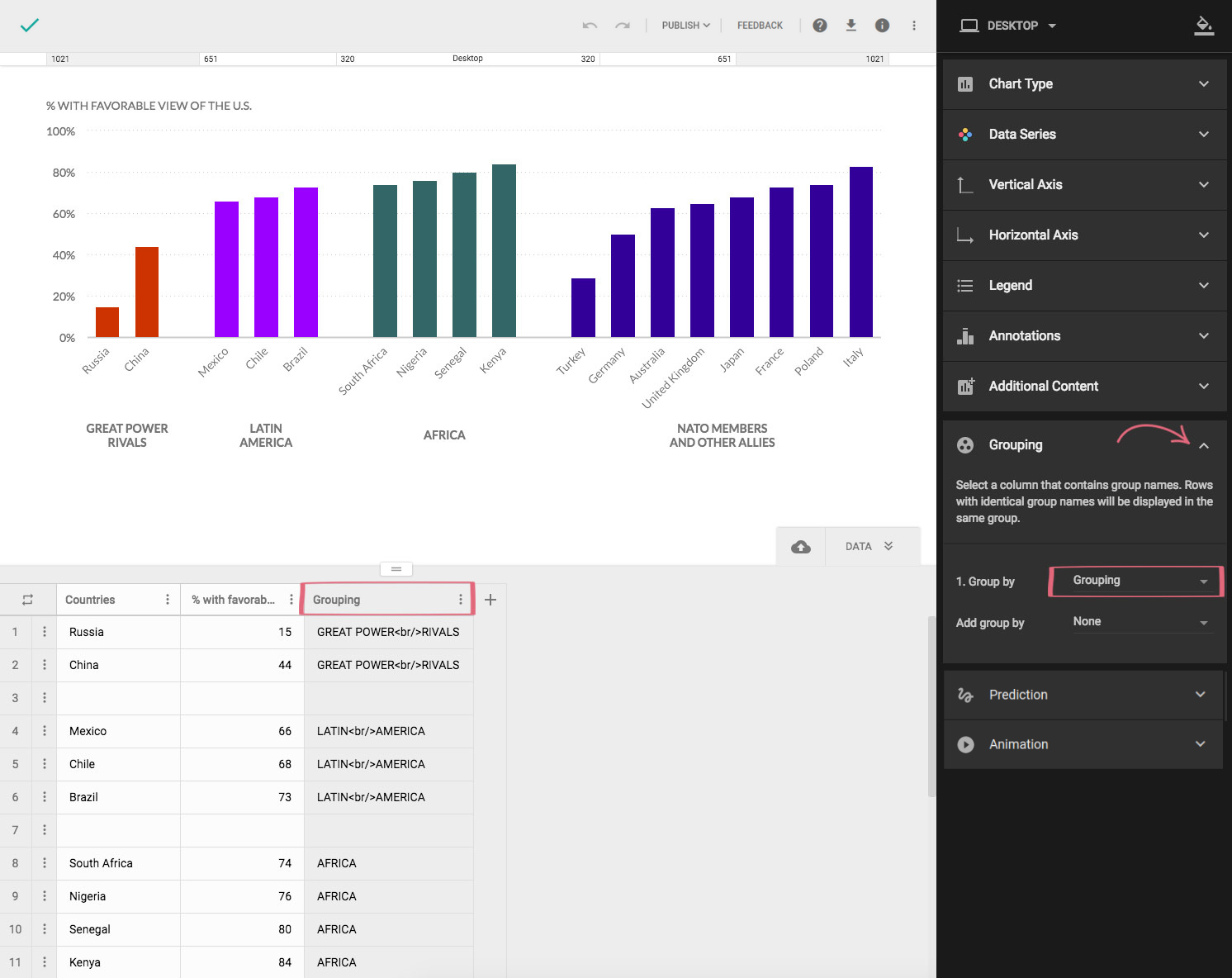 If sorting values by value doesn’t work with your data and the message you’re trying to convey, another way to organize your data is by placing similar values close to each other. The human eye automatically starts looking for patterns and ways to organize information. Your job is to help your readers, otherwise they might abandon your chart if you make it too complicated to notice patterns.