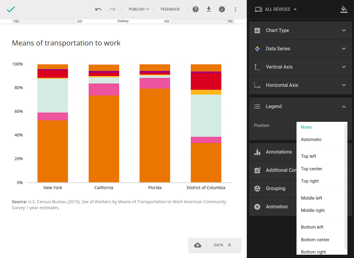 In the right-hand sidebar, you can tweak the color and size of the font used in axis titles and labels, as well as value labels. Charts also allows you to set the font size and opacity for the heading, or the chart title. Keep in mind that the larger and bolder the fonts, the more noticeable they become, so you’ll want to lower the opacity and the font size to let your data shine.