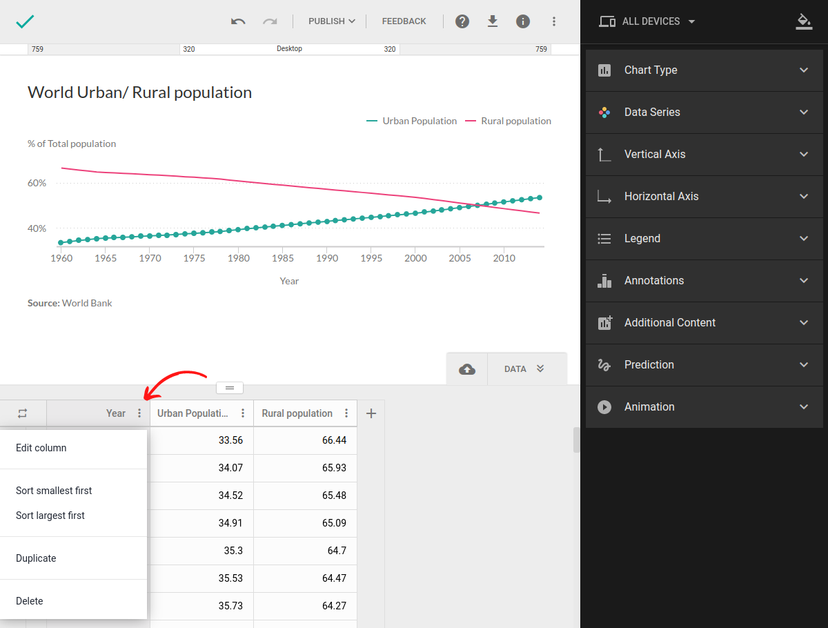 All changes will be automatically applied to the chart as well, and if you sort the column by value, the columns will be reordered to mirror the changes in the table.