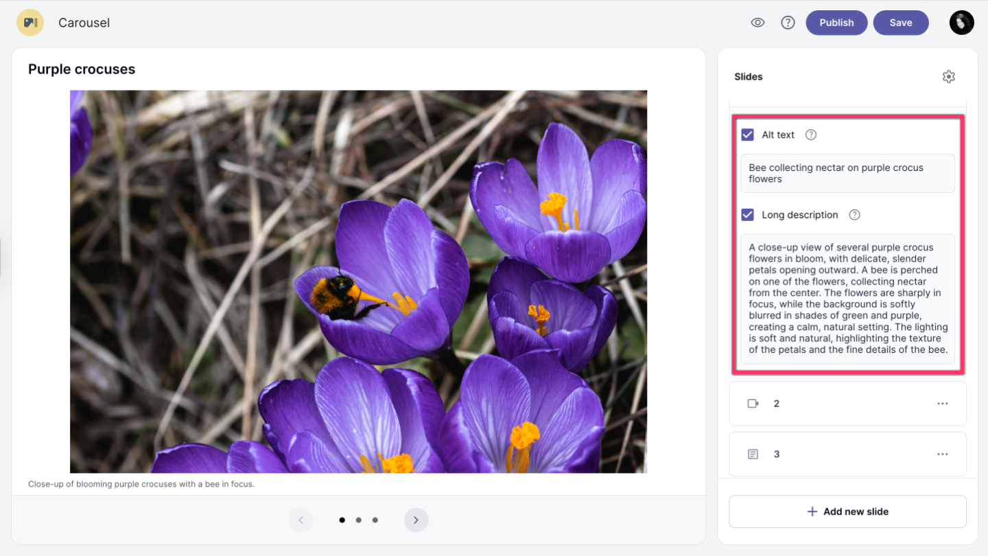 To add Alt text and Lond description, check the option and add your text.