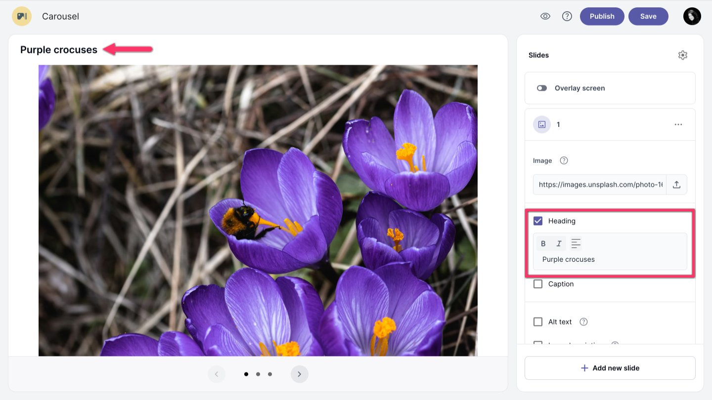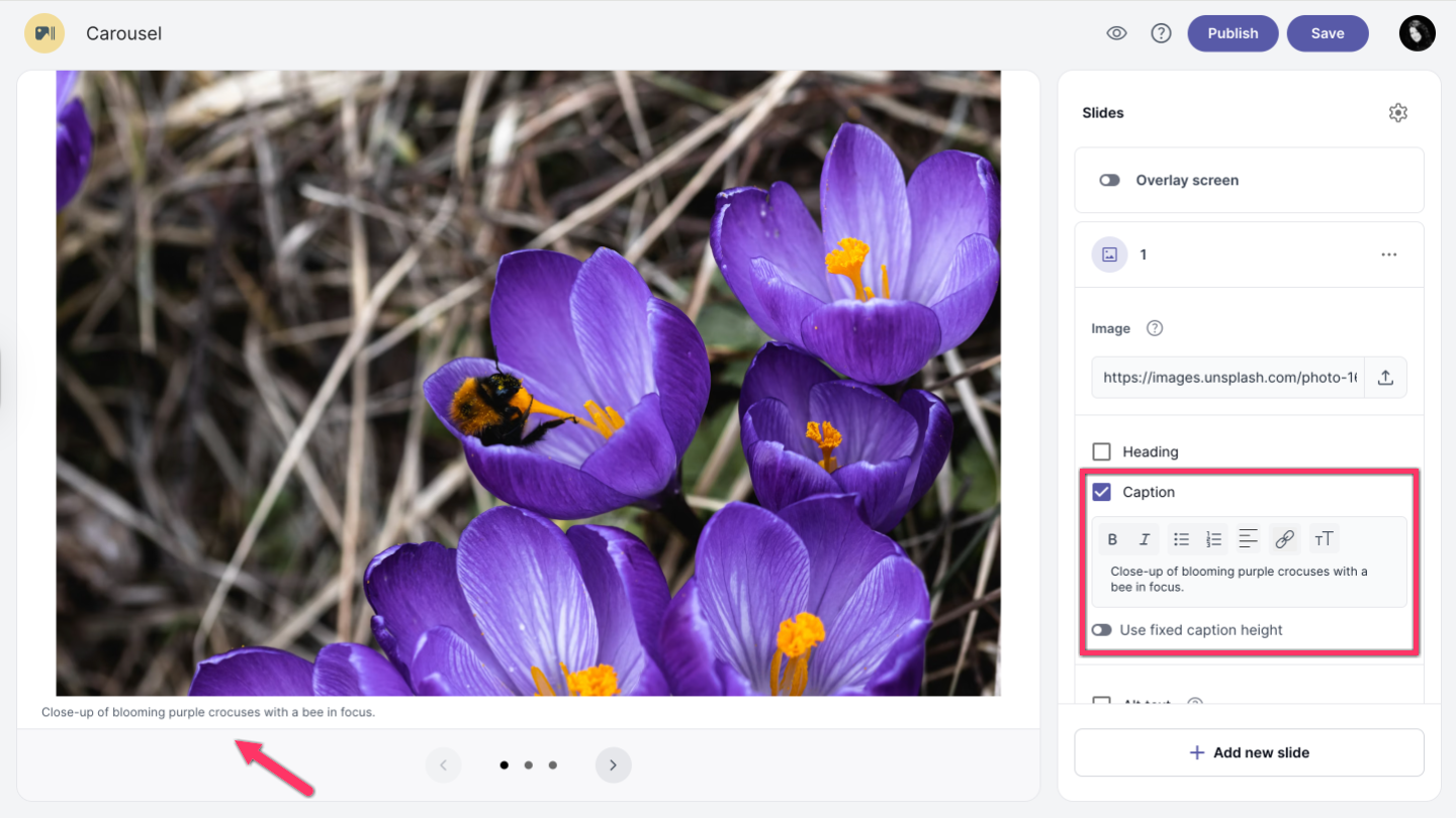 Check the Caption option and add your caption text. You can format the text using options such as bold and italic, create a list, insert a link, or adjust the caption height.