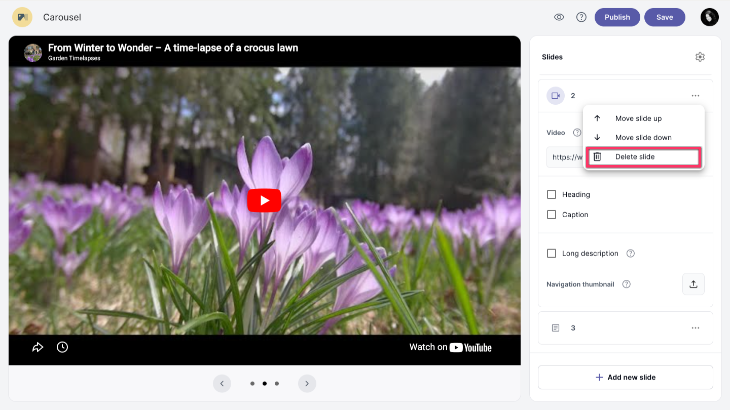 After you create your slides, you may want to change the order of the slides. Click on the three dots and select the Move slide up arrow_upward or Move slide down arrow_downward depending on where you want to move the slide.