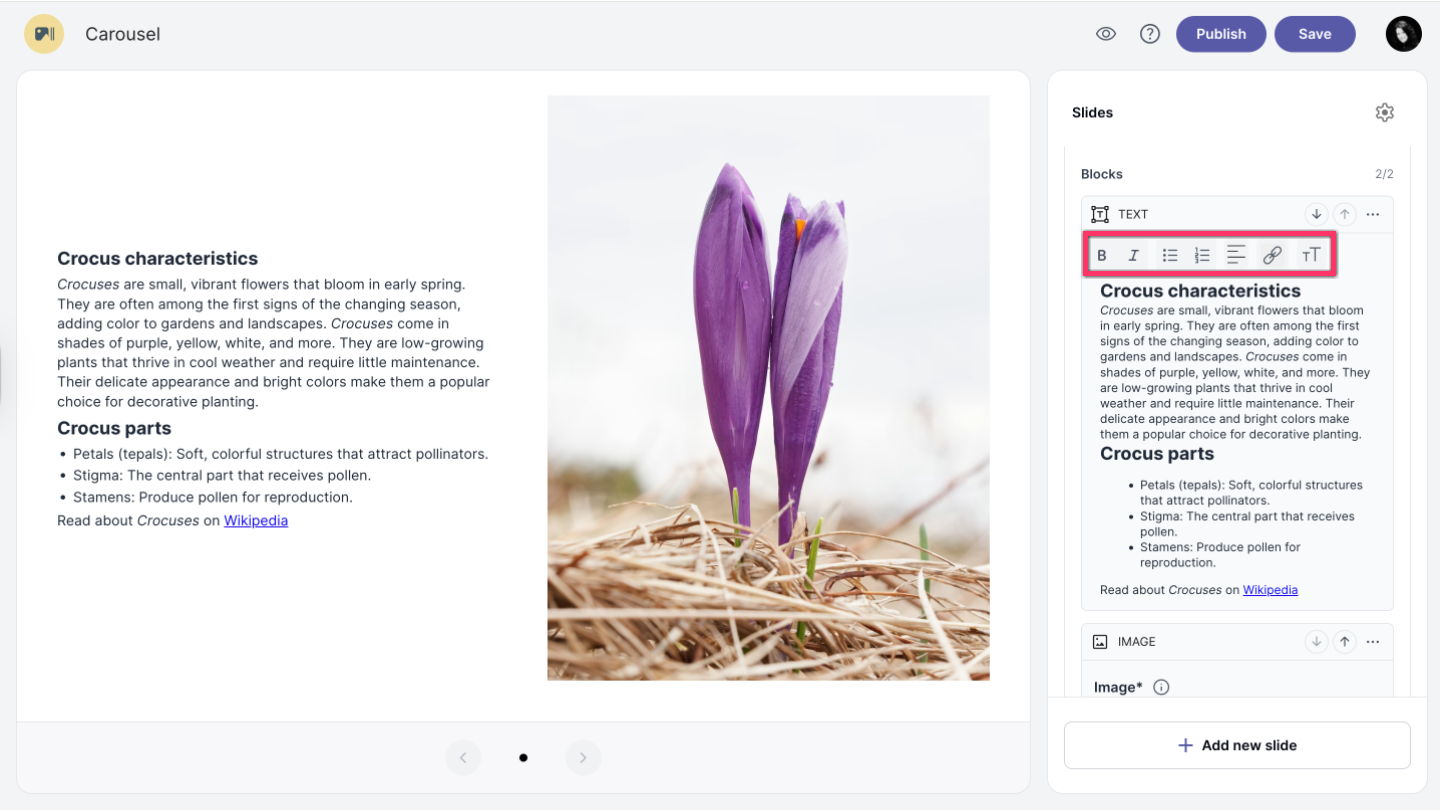 In a text block, you can style your text with bold or italic, format it as a list, adjust the alignment, or add a link to your text.