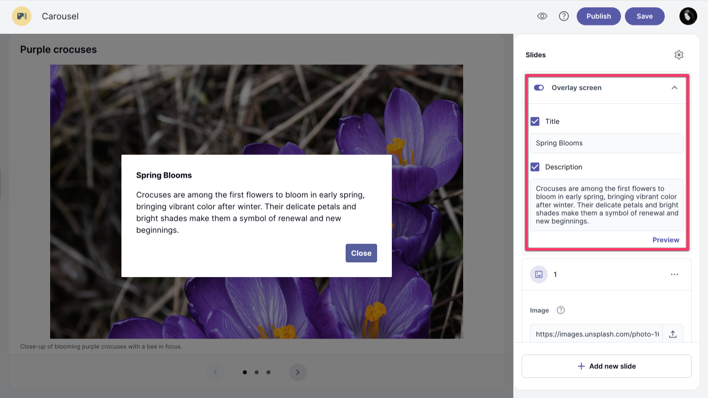 To add an overlay screen, enable the Overlay screen option in the slides panel.