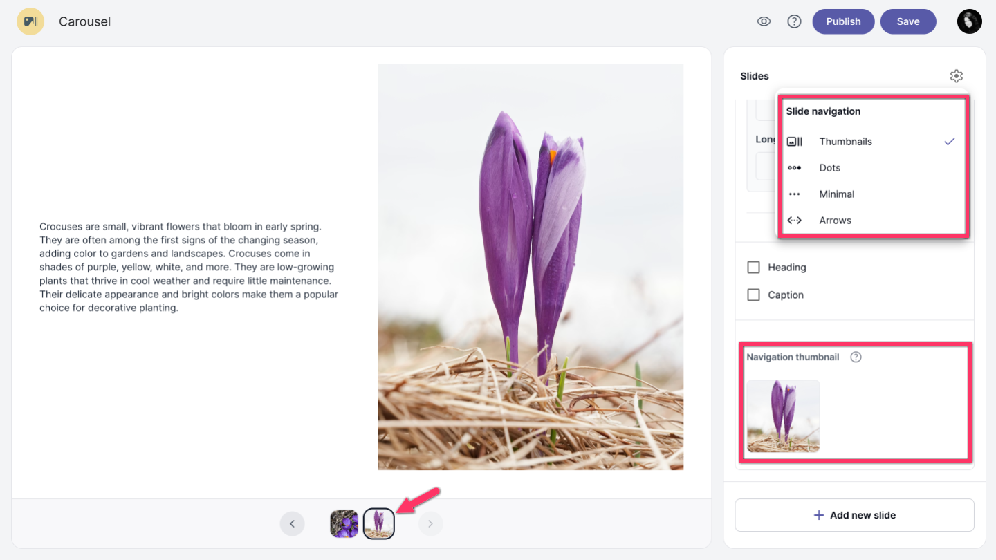 There are several slide navigation options available. Click the settings icon in the right corner and choose Thumbnails, Dots, Minimal, or Arrows. Dots is the default navigation style.