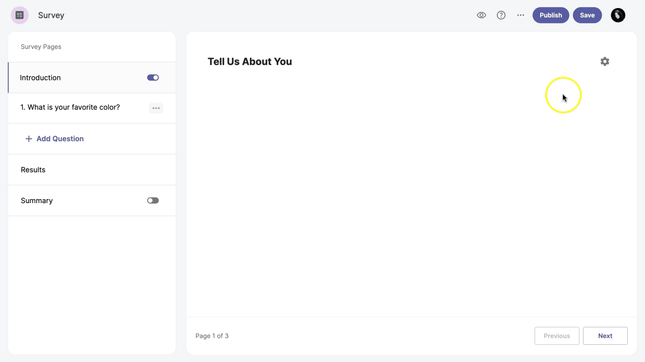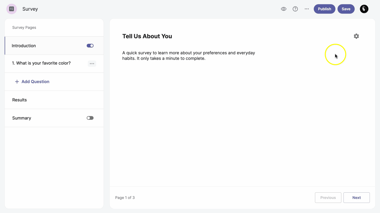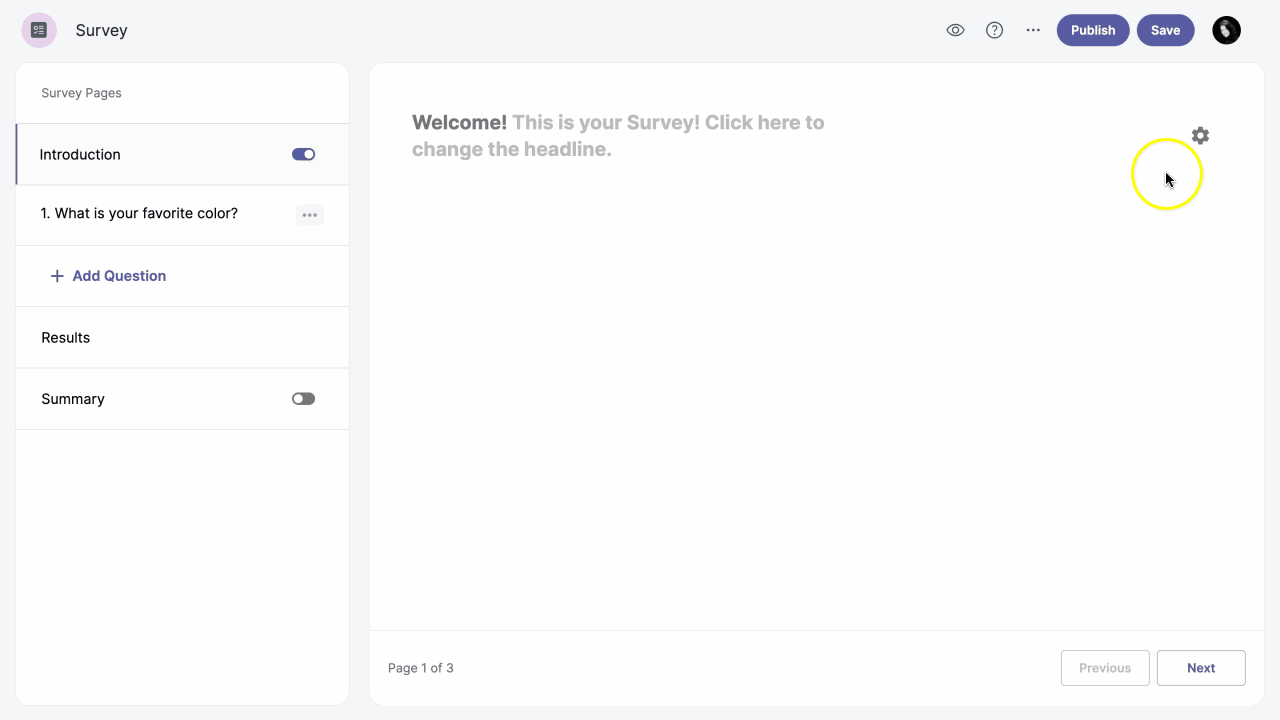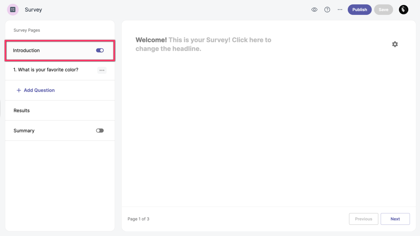 When you create your survey, you will be redirected to the Vizualist Surveys editor. You can add or remove the introduction page by enabling or disabling the Introduction option toggle_on in the left-hand sidebar.
