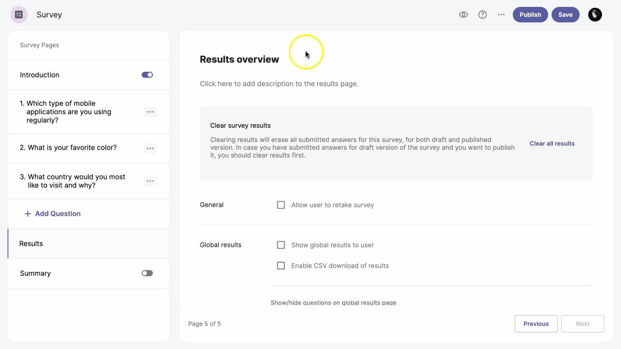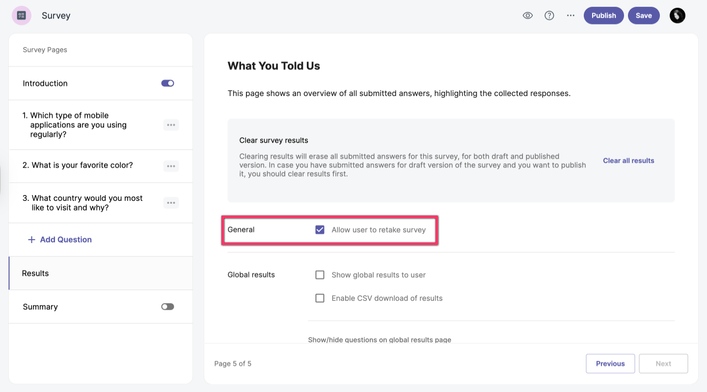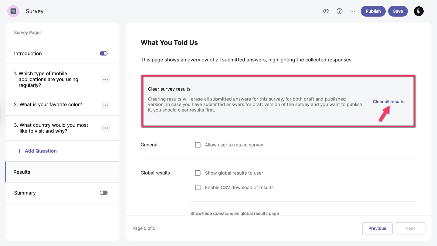 Clearing results will erase all submitted answers for this survey, including both draft and published versions. If you have submitted answers for the draft version and want to publish the survey, you should clear the results first. To remove all results, simply click Clear all results.