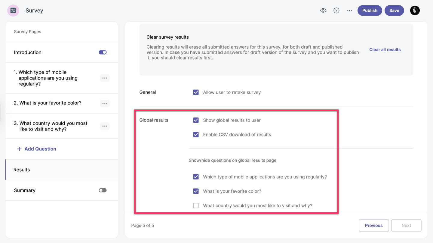 - Show or hide questions on the global results page – You can choose which questions appear on the global results page.