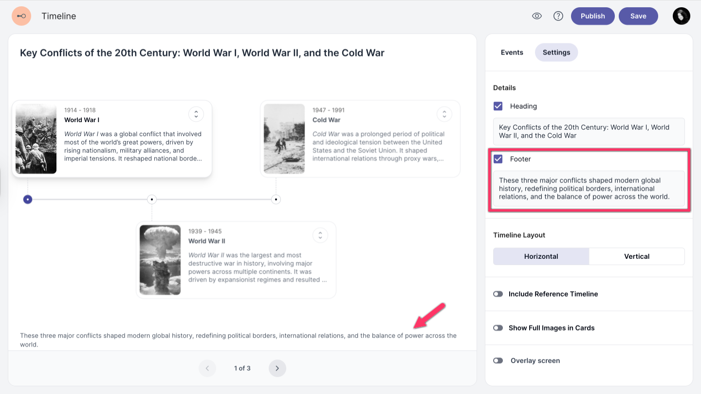 To add a footer to your timeline, enable the Footer option in the settings panel.