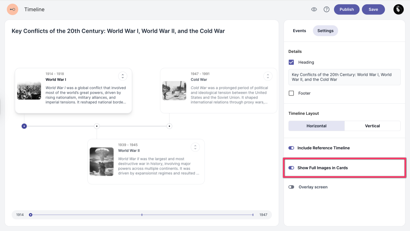 Enable the Show Full Images in Cards option to display images at full size. Otherwise, images will automatically adjust to fit the timeline event box.