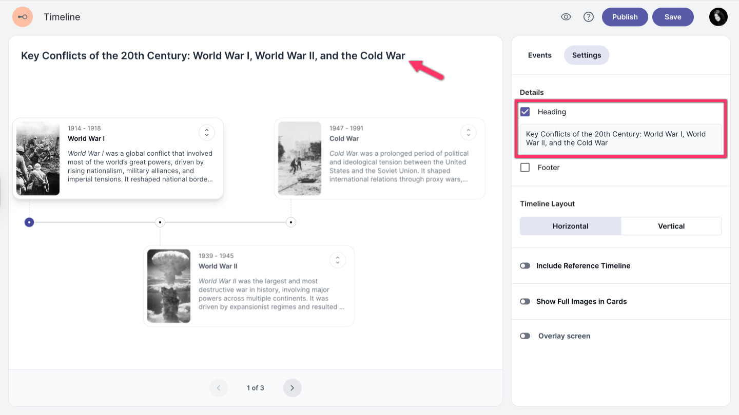To add a heading to your timeline, enable the Heading option in the settings panel.