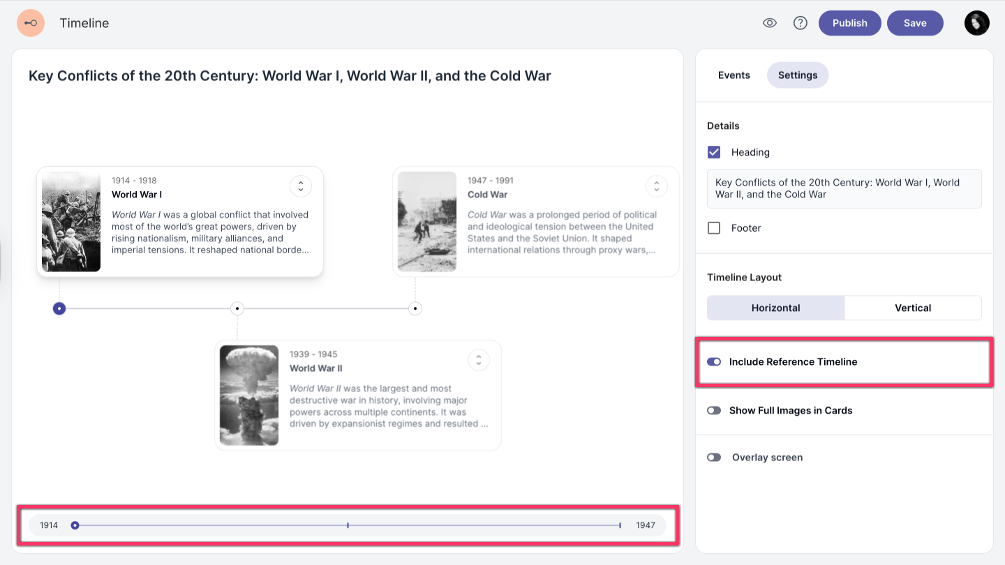 Enable the Include Reference Timeline option to display a slider on your timeline. The slider will appear horizontally or vertically, depending on the layout you selected.